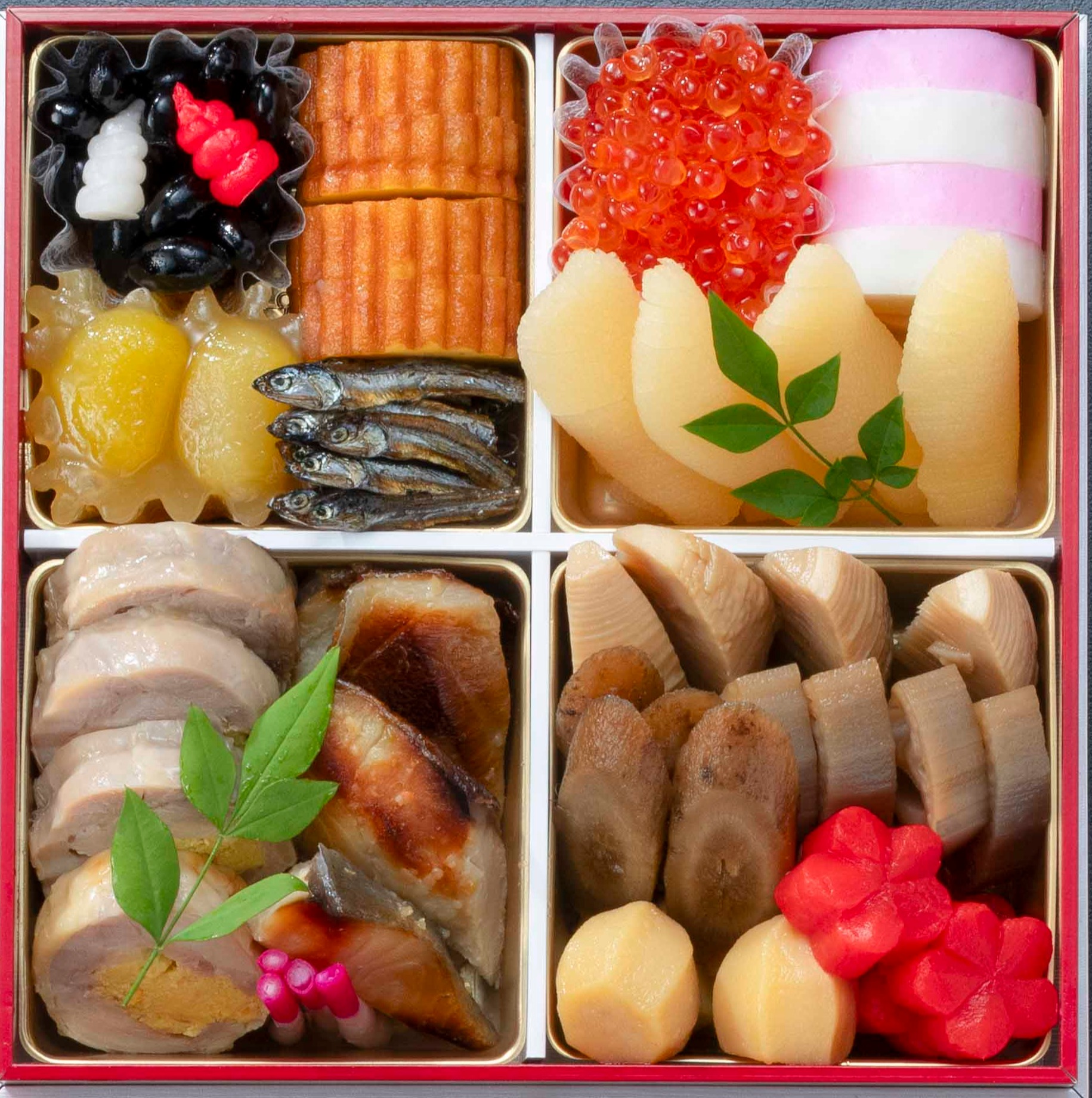 黒豆/紅白千代呂木/柚子伊達巻き/栗きんとん/田作り/いくら醬油漬け/蒲鉾(紅白)/数の子/鶏けんちん巻き/白ひらす西京焼/はじかみ/煮物(竹の子)/煮物(牛蒡)/煮物(蓮根)/煮物(人参)/煮物(豆くわい)