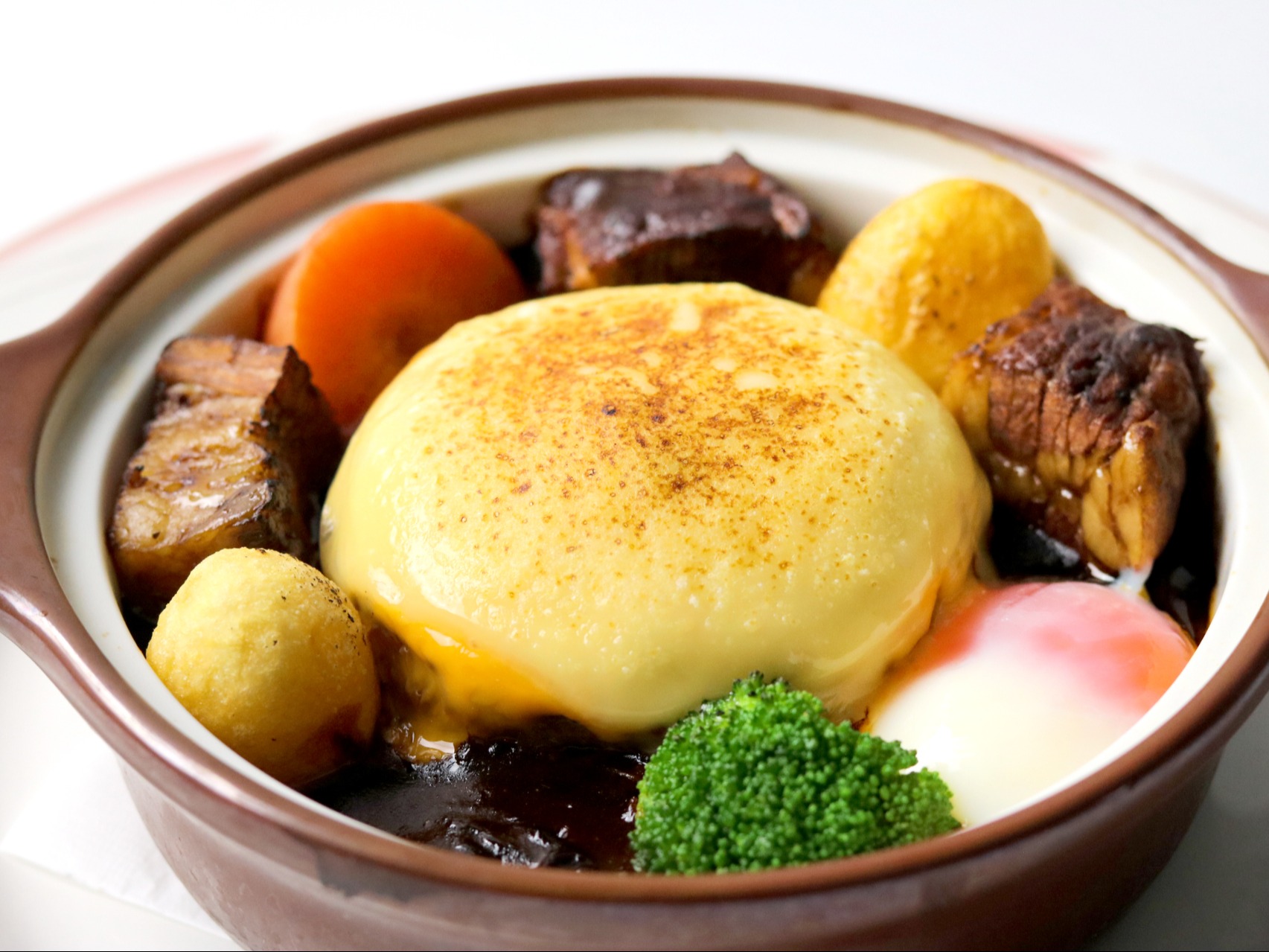 ベーコンをのせたジューシーハンバーグにチェダーチーズをたっぷりとかけました。じっくり煮込んだビーフシチューと温泉玉子も添え贅沢な一品に。