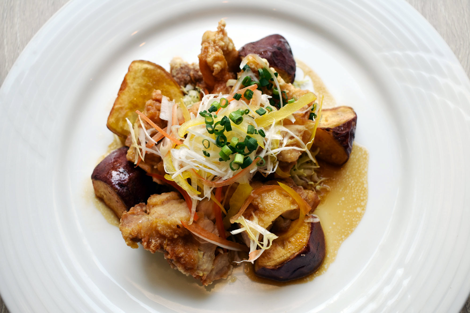 生姜風味の甘じょっぱいソースとの三位一体の味わいが、食欲をそそる一皿。